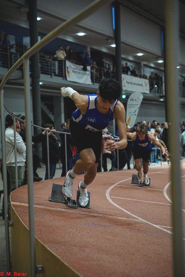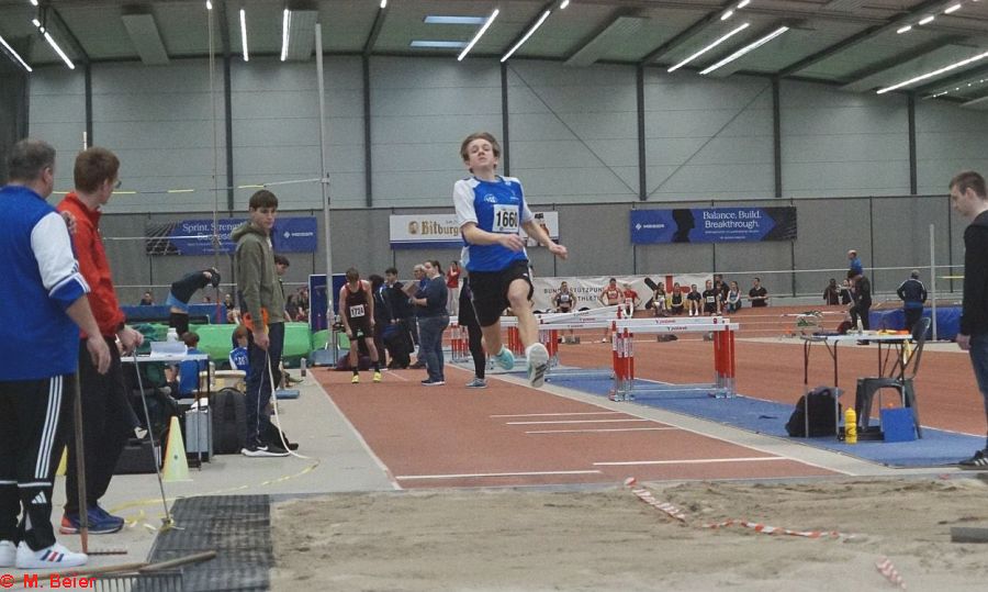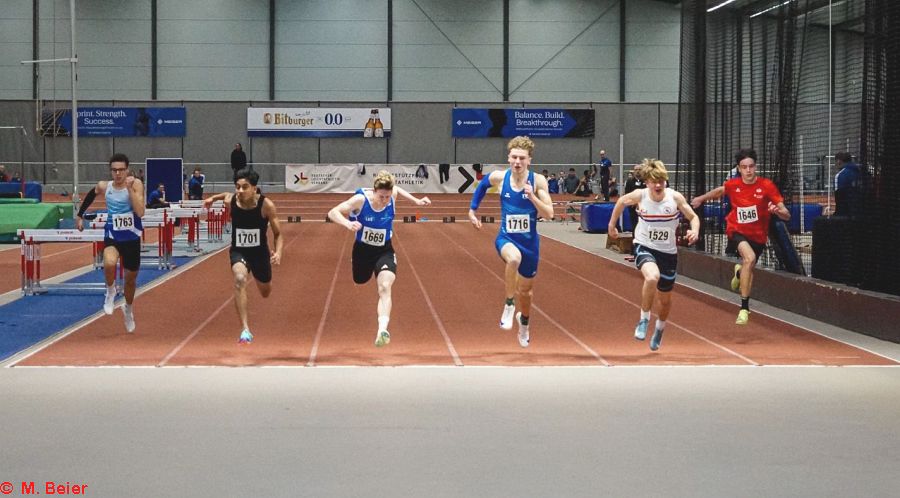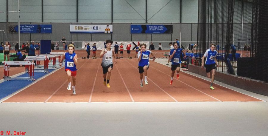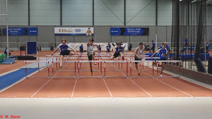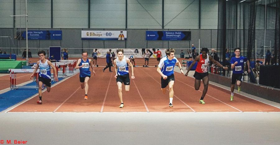 Einen (Sprung-)Lauf hatte an diesem Tag Moritz Beier. Mit jeweils neuen Bestleistungen konnte er sich die Titel im Hochsprung und im Stabhochsprung sichern. Im Stabhochsprung packte er einen halben Meter (!) auf seine bisherige Bestleistung, überquerte 3,60 Meter. Auch im Hochsprung war er mit 5 Zentimeter plus mit übersprungenen 1,65 Metern nicht zu schlagen. Sprungtitel Nr. 3 im Weitsprung blieb ihm allerdings verwehrt. Mit 5,39 Metern kam er bis auf fünf Zentimeter an seine Bestleistung heran, musste sich dennoch seinem Vereinskameraden Cédric Wenzelburger geschlagen geben, der sich nach schwierigem Einstieg in den Wettbewerb mit 5,50 Metern die Meisterschaft holte. Seinen ersten Titel hatte sich Cédric bereits vorher über die 60 m-Hürden in 9,47 Sekunden gesichert. Dabei verhinderte die in die Jahre gekommene, unebene Bahn, dass er sich mit verbessertem Start eine neue Bestzeit holen konnte.